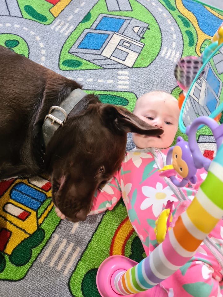 6 months after being hired, Boof was promoted to CHO and Creche Supervisor. He absolutely loved his new role which included looking after a baby, letting baby annoy him, annoy baby back, licks when mum isn't watching, and lots of cuddles.