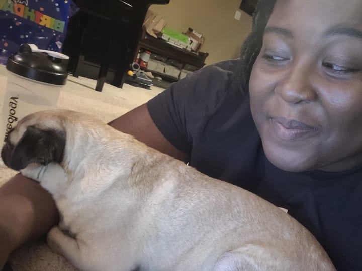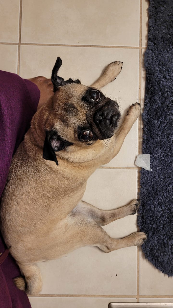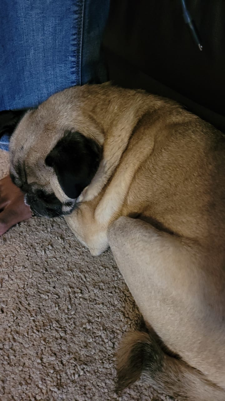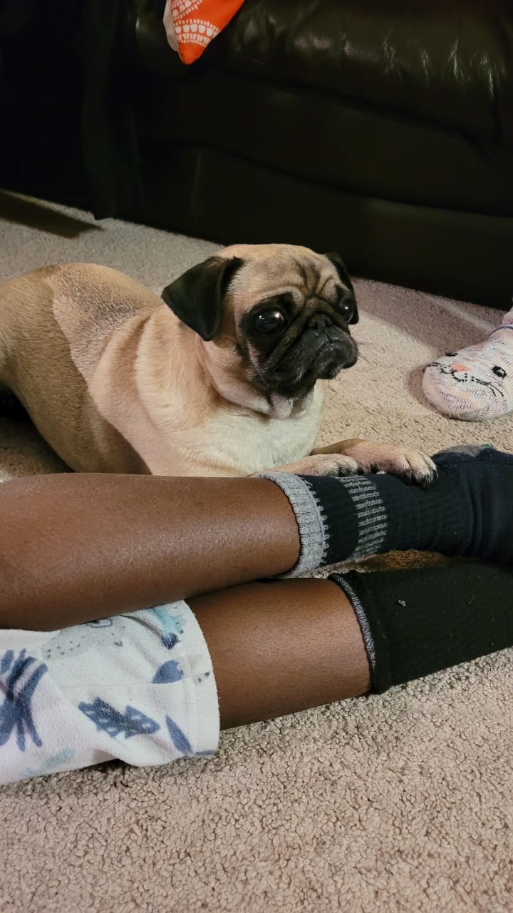 Nicknames aside, she is a very serious pug who loves to play but doesn't love to be touched. Unless it's on her own terms. Let me explain. Nala gets excited when you pet her head and scratch behind her ears. Like any pet. However, if we go to gently play with her paw or cuddle next to her...she either jerks herself away from the point of contact or gets up and leaves the vicinity completely. She loves being around us, don't get her wrong. But ever since she was a puppy, she only liked contact that she welcomed on her own. She isn't a cuddle bug at all. This is why this memory/these memories will always be cherished.