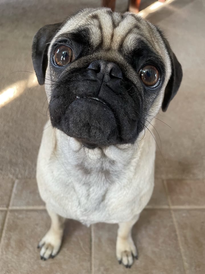 My next plan was to open the front door. Front door openings usually bring our two pugs to us like magnets. And sure enough, one of my two pugs rushed over to the door immediately to check things out. But not the little pug with the squeaker in her mouth.