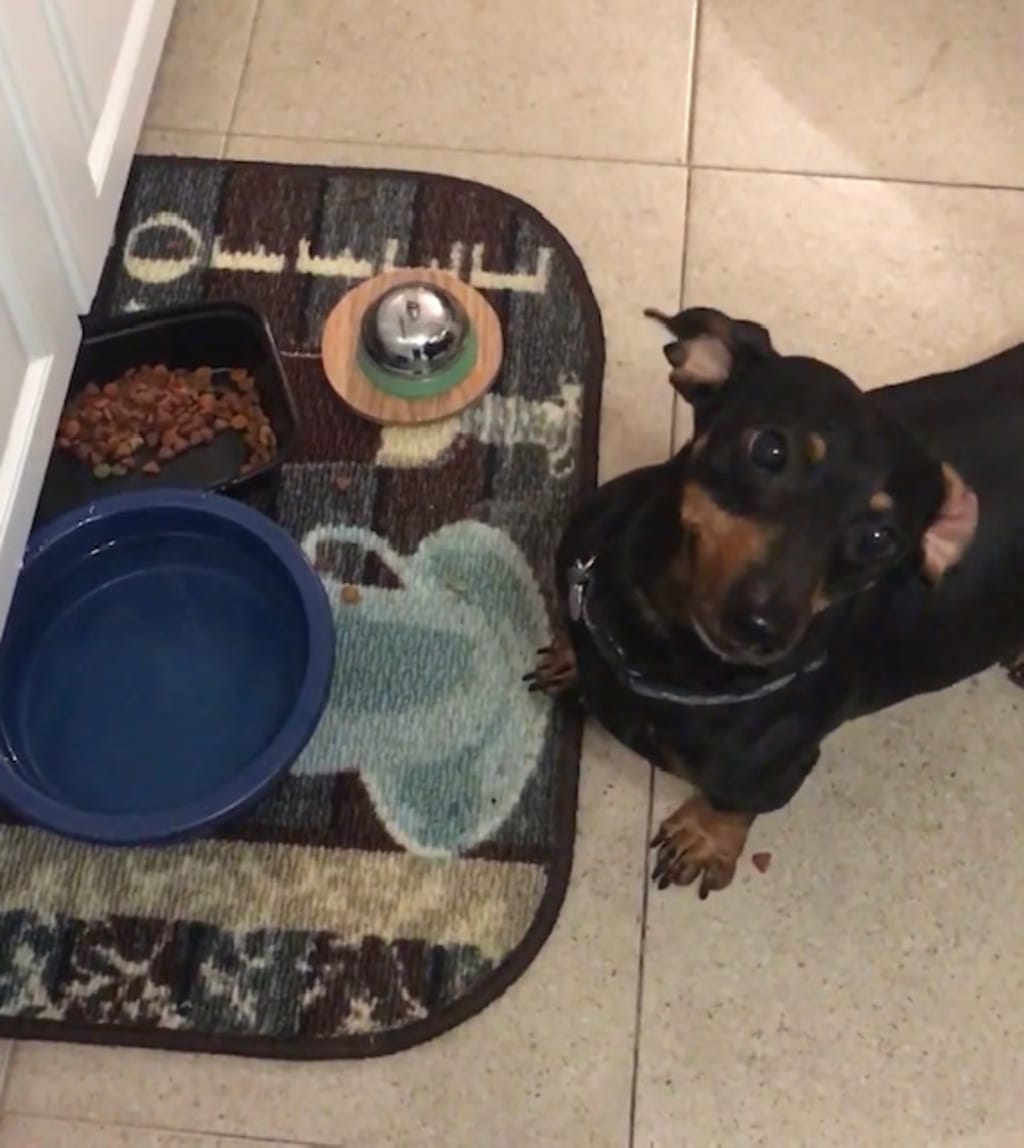 We practiced every day after that. His tail wagging wildly when I put the bell on the floor. He rang the bell. He got a piece of chicken.