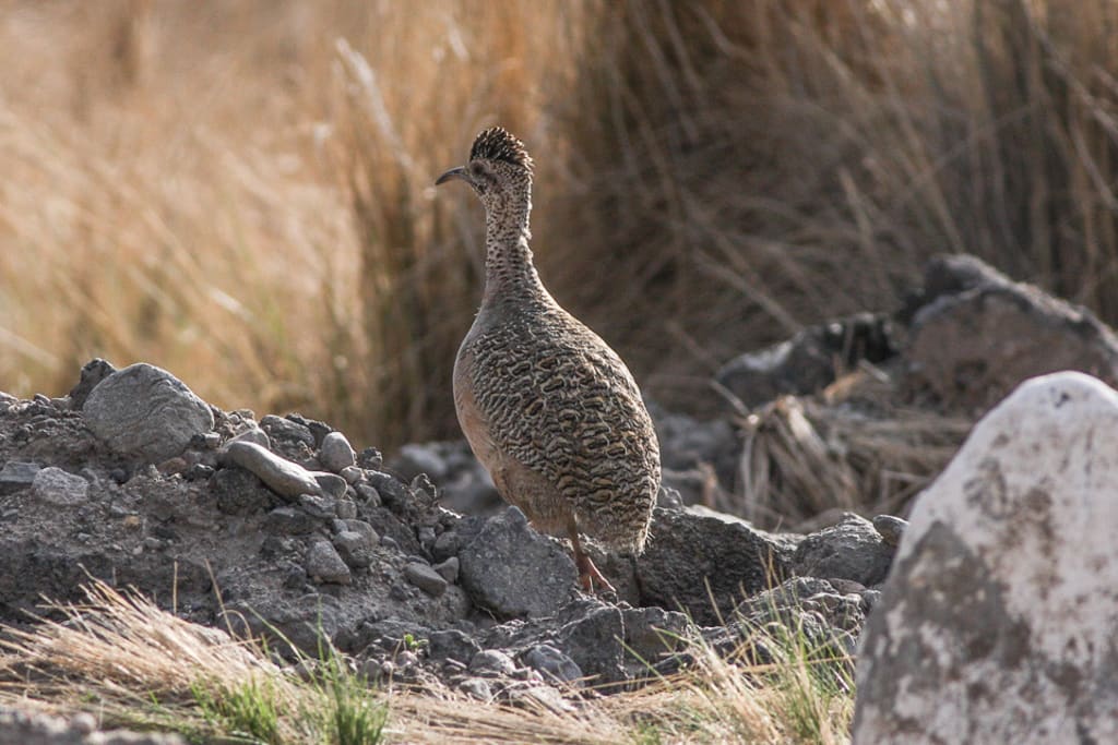 The ornate tinamou (Nothoprocta ornata) is a type of tinamou typically found in high altitude grassland and dry shrubland in Central South America subtropical and tropical west regions. Ornate Tinamou is a typical member of Large Andean family, Nothoprocta. From the south of central Peru through Bolivia to Argentina and Chile, these species occupy steppes of high elevation, especially hills dominated by bunch grass at 3500-4800 m. The Ornate Tinamou, if viewed from afar before it flushes, appears to be a fairly smooth blend of earth tones. However, when seen at close range, Ornate Tinamou appears to live up to her name: the female is very striking, being heavily patterned over the back and wings with white edgings and bandages. Tinamous are woodland birds with relatively short tails and long wings; they mimic shallow quails. Ornate Tinamou is a large tinamou with long crown feathers, which are often lifted, forming a bushy crest. The top pieces are mainly ochraceous grey, intricately patterned with vermiculations, bars and brownish white, brown, black, and light buffy yellow to tawny buffs. The subparts are typically grey and less marked, light on the abdomen and buffered. The southern populations appear to be bigger, lighter and more browner than the animals in northern and central Peru. Ornate Tinamou lives in open high elevation habitats from central Peru, in Ancash's western Andes, south to southern Peru, west Bolivia, northern Chile, and northwest Argentina. The diet of Ornate Tinamou includes "clover and other small leaves, beans, blooms, nuts, berries, plants of the heart, fruit and vegetables" You will repeat this call for up to three hours, at 3-20 s intervals. More widely heard is a call of unknown origin, identified as eee-arr. Most of the information on the general behaviour of Ornate Tinamou derives from. These tinamous people spend all of their time on the edge, even as they climb high positions like sunbathing, preening, or naming boulders. The head is usually left down while the tinamous feeds but the bird raises its head to look around for a few pecks. When irritated these tinamous also cover up behind a clump of grass for accurate observation. A pair of Ornate Tinamous can fly very slowly when foraging, taking up to two and a half hours to feed on an area of about 0.2 ha; solitary birds search more briskly and occupy more ground. A fast beat of wings initiates takeoff, but then the wings are kept silent and the tinamou executes a glide, landing out of sight, if possible, after covering about 50-200 metres. Nearly all flights are downhill, and at arrival, the bird always races even faster. In fact, the usual evasive action is sprinting away for up to 20 m and then squatting under a clump of grass or tola. Ornate Tinamou most commonly feeds on lush green seps, usually low on the hillsides or along the valley floors. Some people migrate downhill to 200 m to feed on seeps, and then back uphils. If a bird of either sex is agitated, it can draw the feathers into what appears to be a black crest. On the female of Ornate Tinamous the crest is most commonly seen. Courtship mainly consists of offering follow-up meals. The male forages in front of the female and displays either head or tail towards the female, raising the rump and spreading the feathers of the tiny rumps at the same time, frequently twittering and squeaking. The rising rump shows crissum feathers spotted in rust and a slight dark patch on each side of the vent. The female then normally dashes away from one to three m, generally from a position in front behind the male. The demonstration may be repeated if the female sits at the end of the dash; and if the female squats at the end of the dash, copulation immediately happens.