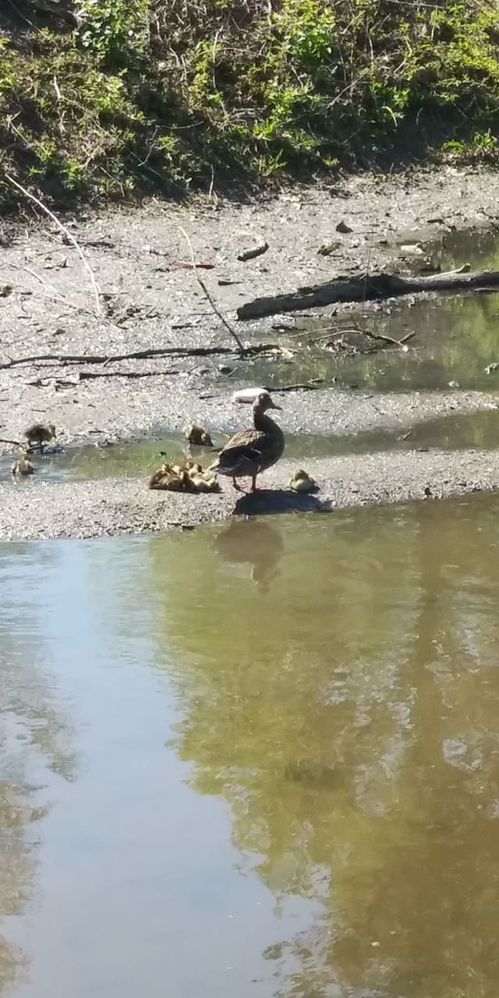 May eighteen, two thousand and twenty-one, I thought the ducklings had learned how to fly and took off, but this was not the case as I was driving to work one rainy day; the female had ducklings playing in the street. They especially enjoyed the fast-moving water at the street's edge. It was moving fast but not so fast as to sweep them away. When the mother saw me coming, she limped and waddled towards the left side of the road, but her young did not move. I honked and said for her to get them out of the street; to my surprise, that is precisely what she did! I know she did not understand me, but I guess I scared her into saving the young ducklings.