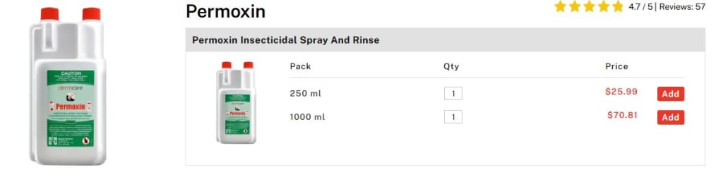 Permoxin is a liquid treatment containing permethrin, a synthetic pyrethroid that targets and kills parasites such as: