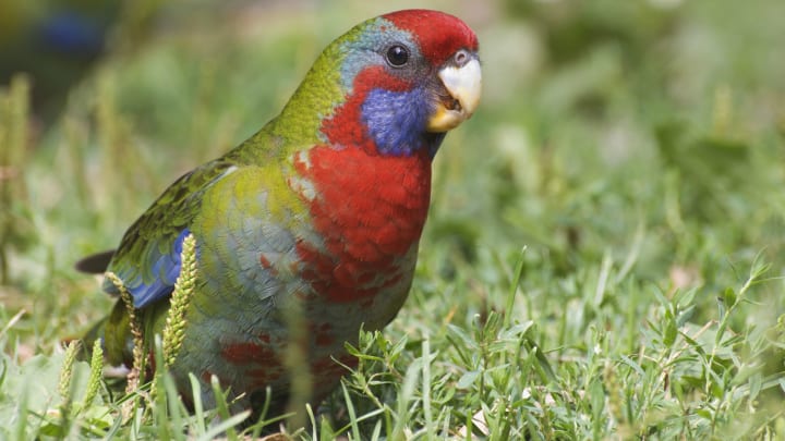 Eastern rosellas make their homes in Australia and Tasmania and have been introduced to New Zealand. Their habitats are lightly wooded areas. They have white cheek patches and red feathers on their heads, necks, and breasts with yellowish to greenis upper parts and a yellow underbody with the tail end being yellow-green to blue-green and a red undertail with blue shoulder feathers.
