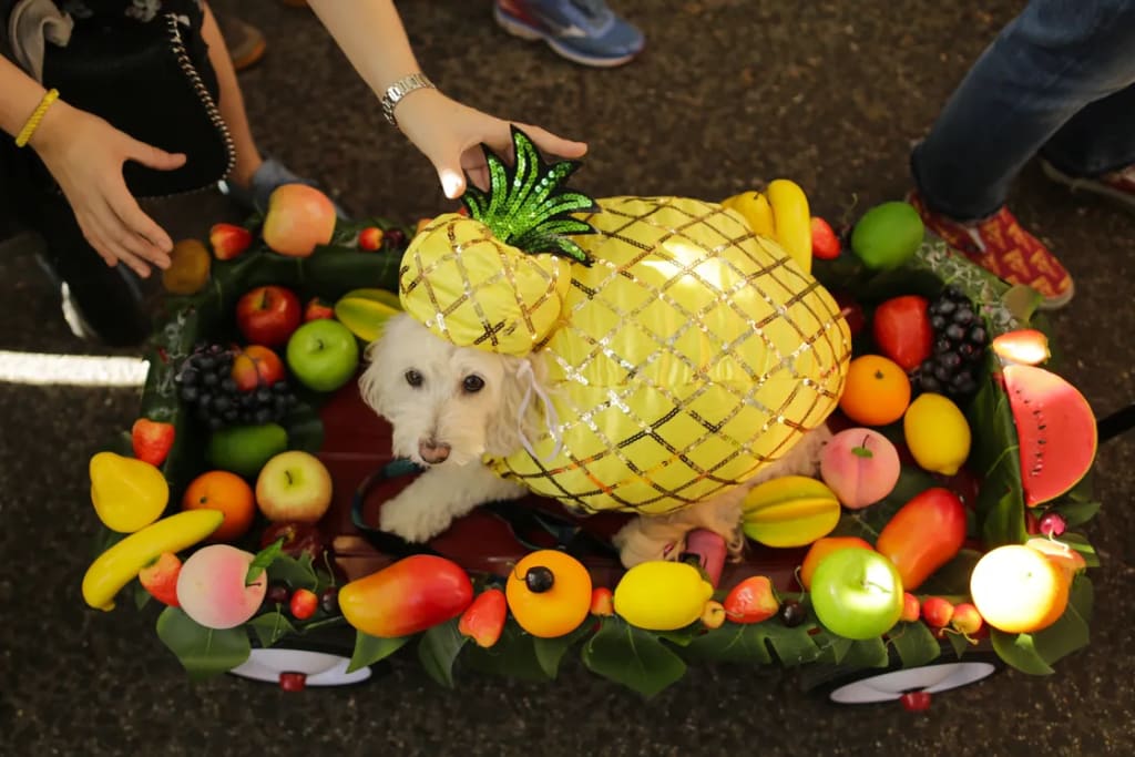 This year for Halloween, I will be dressing up my dog up as a pineapple in a fruit basket . Last year, I put her in a bandana and cowboy hat and said she was her namesake. My first dog, who passed away last year, had been a queen, a mermaid, a dinosaur, and Superman. She didn’t much like being dressed in costumes, but the pictures were cute, and got all those likes on Facebook and Instagram.