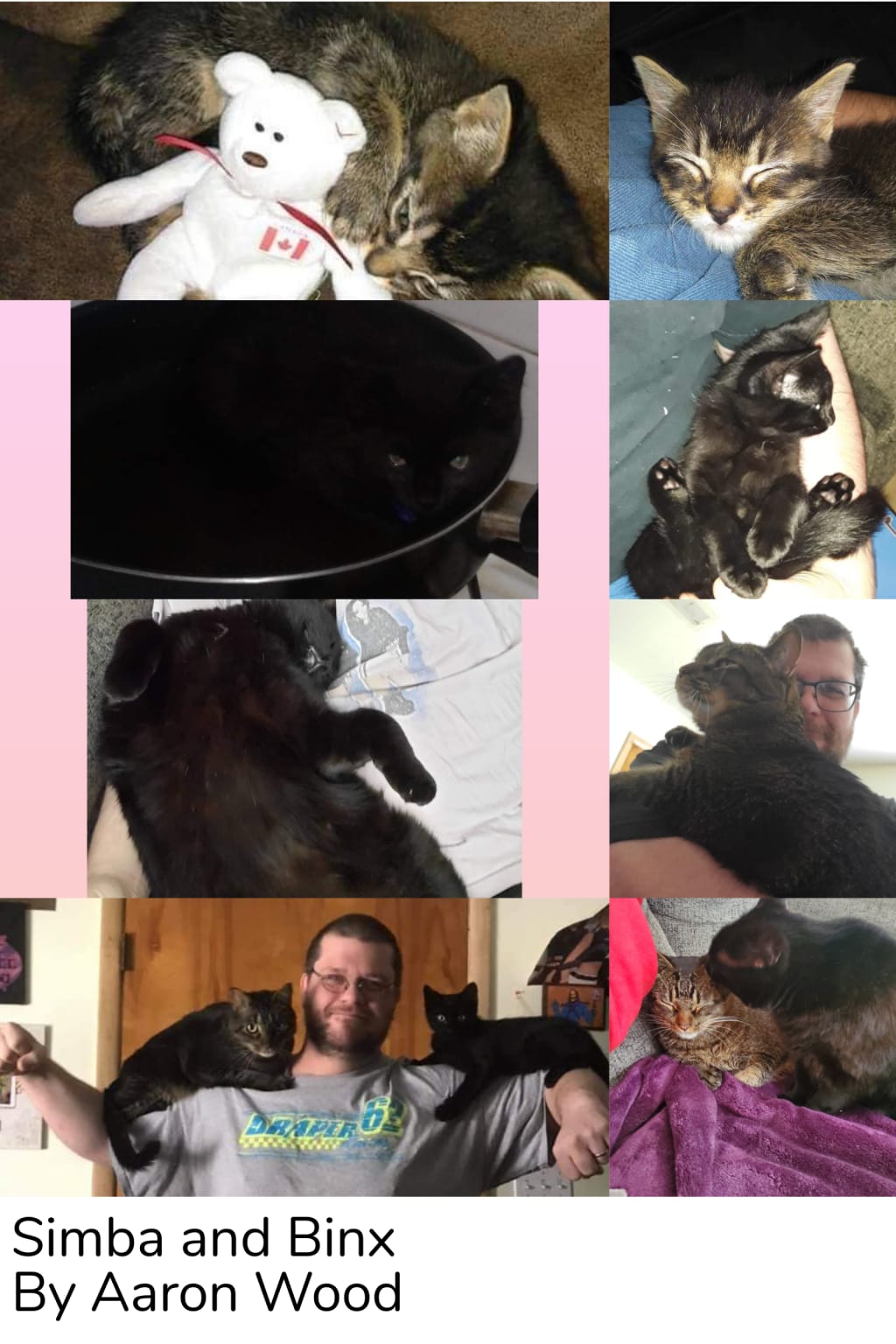 My wife and I have two cats, Simba and Binx. I got Simba about five years ago, a mewing little fur ball that was malnourished. Simba started affectionate towards people but as he grew older he became more and more distrustful of strangers. I attribute that to how his life started and could very well have ended, but I can't say for sure. When I picked up Simba to take home, I was watching my sister's cat Ninja. Ninja was a big black cat, very affectionate, and wasn't bothered by Simba as I was expecting but he did try sniffing Simba at first. Simba put up with it until he got to the base of his tail and then he turned around and “slapped” Ninja in the face. The look on both of their faces cracked me up so hard! Ninja and this tiny brown and black striped kitten competed for my lap too, they both wanted my full attention.