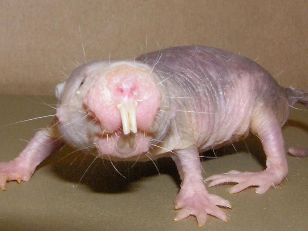 The naked mole-rat is an animal that has no fur and is nearly blind. These animals live underground in colonies similar to insects. Their nearest relatives are porcupines, chinchillas, and guinea pigs. Not completely bald they have about 100 fine hairs on their bodies acting like whiskers to help them get around. The hairs found between their toes help the naked mole rats to move soil between them while they are digging tunnels. They are among the longest living of all rodents and can live for nearly 30 years and have an amazing resistance to cancer.