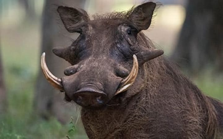 Warthogs are wild members of the pig family. They have the characteristic pig noses, tusks protruding from their mouths, wart-like curvatures to their faces and a mane of hair that falls down their backsides. Warthogs bodies are covered with bristles and they have large heads and wart-like pads for protection. They are well adapted to their savanna and grassland habitats and live in burrows.