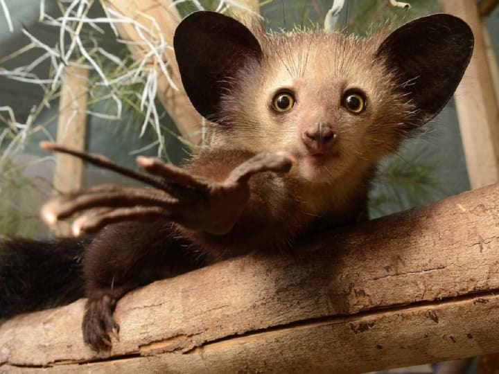Aye-Ayes are animals with a gremlin-look to them and make their home in Madagascar. Among their unusual traits are long, bony middle fingers used to get insects and grubs out of tree trunks. These animals are nocturnal and come out only at night. Aye-Ayes have incisors that grow continually and very large ears. They have the ability to use their skeletal fingers to tap on a tree branch and then listen with their large ears if there are echos coming from the tree. Once they determine that they are above an insect tunnel they tear off chunks of the tree with their big teeth and once the tunnel is uncovered can feast on the insects.