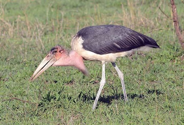 Maribou storks stand at over five feet tall and have an over 10 feet wingspan. They are scavengers of large carrion. These are African birds that also eat other birds and will feast on flamingos. By defecating all over their legs and feet gives their appendages a white appearance and helps them regulate their body temperatures. These birds are lazy and prefer standing around and pant in very hot weather.