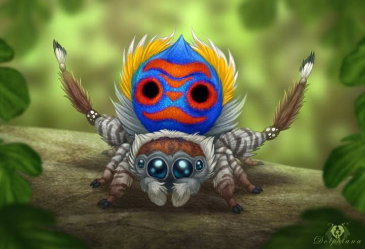 Peacock spiders are in the jumping spider family and are only referred to as "peacock" because they have vibrant color patterns with the male spiders being the most vibrant, They have red, blue, and black extensions to attract mates. The males' problem is that when they perform the mating dance, the female might attack and kill and then make a meal out of the male spider.