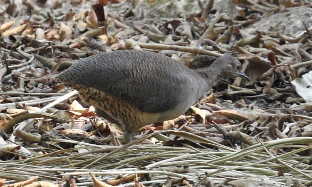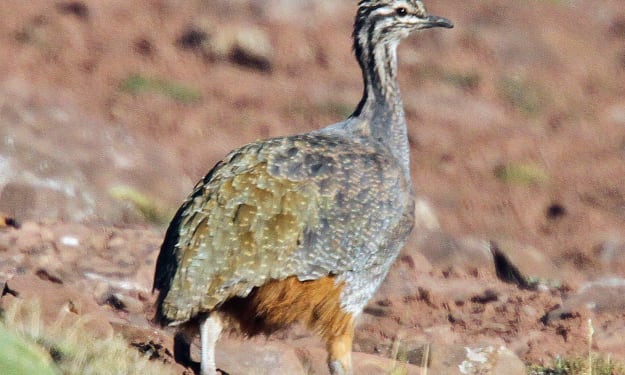 The red-winged tinamou (Rhynchotus rufescens) is a medium-sized, land-living bird from central and eastern South America. Some specific names for the genus include perdiz grande, ynambu and rufous tinamou. Both tinamou are from the family Tinamidae, and are thus ratites in the broader scheme. Unlike other ratites, tinamous can float but in general they are not good fliers. All ratites evolved from ancient flying birds, and tinamous are the closest surviving descendants of such birds. Coenraad Jacob Temminck first described the red-winged tinamou from a specimen from São Paulo state, Brazil, in 1815. The red-winged tinamou has three subspecies: Rufescens, the called race, occurs in south-eastern Peru, Bolivia, southeastern Paraguay and northeastern Argentina, and possibly Uruguay; Catingae occurs in central and north-eastern Brazil; Pallescens occurs in northern Argentina; east Formosa, Chaco, Santa Fé, Córdoba, La Pampa, Buenos Aires, Entre Ríos, Corrientes, and Rio Negro. The taxon maculicollis was initially considered a red-winged subspecies of tinamou, but it is now considered, after SACC, to be a species in its own right; the huayco tinamou. The common name refers to the bright rufous primaries which are often visible during flight. The red-winged tinamou is about 40 to 41 cm long and weighs about 830 g, and the female can be much larger. This has a black crown, rufous primary beneath, and light-gray to brown. It may have black bars on flanks, belly and airflow. The throat is also whitish, with cinnamon in the foreneck and the breast. The pointed bill is horn-coloured, with a blackish culmen. This covers Southeastern, Northeastern, and Southern Brazil, East Paraguay, Southeast Peru, Bolivia, and Eastern Argentina. At lower elevations this avoids marshy grasslands and edges of forest. While at higher elevations of up to 2,500 m it may visit arid shrubland, pastures, and grain fields. Generally this supports dry savanna. The red-winged tinamou has vocal males followed by shorter sad whistles, which are a continuous ringing single whistle. The woman hits not. This species is most involved during the heatiest hours of the day. The diet varies by season; it takes insects and other small objects during the summer, and it turns to vegetable matter such as berries, shoots, tubers and bulbs during the winter. It can be an agricultural pest, feeding on cereals, rice and peanuts, as well as predatory, capturing poisonous snakes and occasionally flying up into the air to capture an insect from a vineyard. The species ' male targets the female by feeding and then heading to the nest where she lays her eggs and then the chicks are born. As all tinamous, the red-winged tinamou is a common hunting destination and has declined in areas with high population density, but the species has also expanded in some areas where forest clearance has created suitable habitat. Generally it is not considered a threat, and is thus listed as the Least Concern by IUCN. It has a gross surface area of 5,700,000 km2. Red-winged Tinamou is a stocky tinamou in the east of the Andes, in central South America, with marshes, grasslands and agricultural areas. It's round-bodied, with black barring on slender brown wings and tail, a ruddy-colored head, dark crown and a thick, slightly decurved bill. There are three known subspecies: Peru, Bolivia, Paraguay, southeastern Brazil, and northern Argentina nominate rufescens; central and northeastern Brazil catingae; and central and northern Argentina pallescens. While poaching pressure and habitat destruction due to burning have resulted in destruction of population, Red-winged Tinamou still usually abounds across its large geographic range. Red-winged tinamou takes longer time than other birds to reach mature weight, and steps should be taken to shorten this time period for commercial production.
