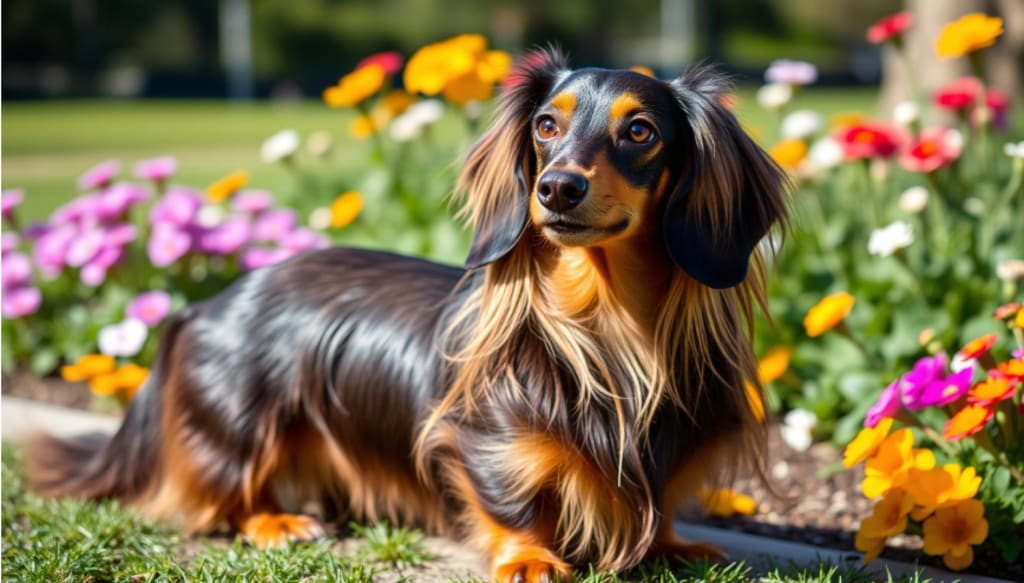 "Long-haired dachshund with silky fur, elegant posture, playful expression, showcasing unique coat patterns, large expressive eyes, long ears, and a charming demeanor, set in a sunny park surrounded by colorful flowers."