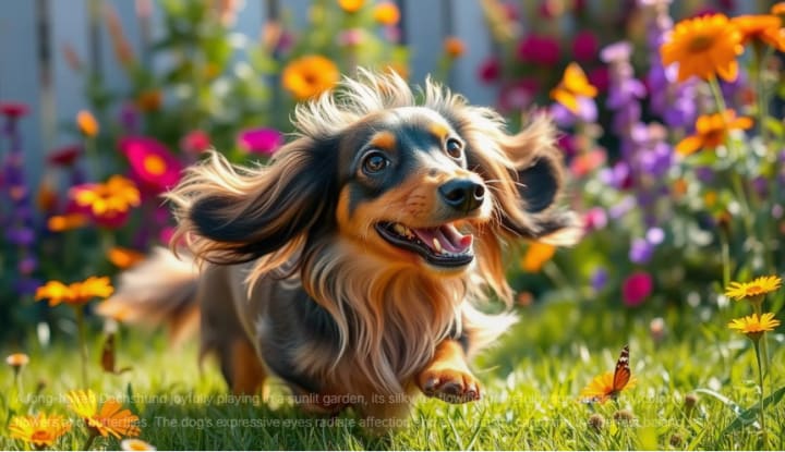 A long-haired Dachshund joyfully playing in a sunlit garden, its silky fur flowing gracefully, surrounded by colorful flowers and butterflies. The dog’s expressive eyes radiate affection and enthusiasm, capturing the perfect balance of playfulness and loyalty.