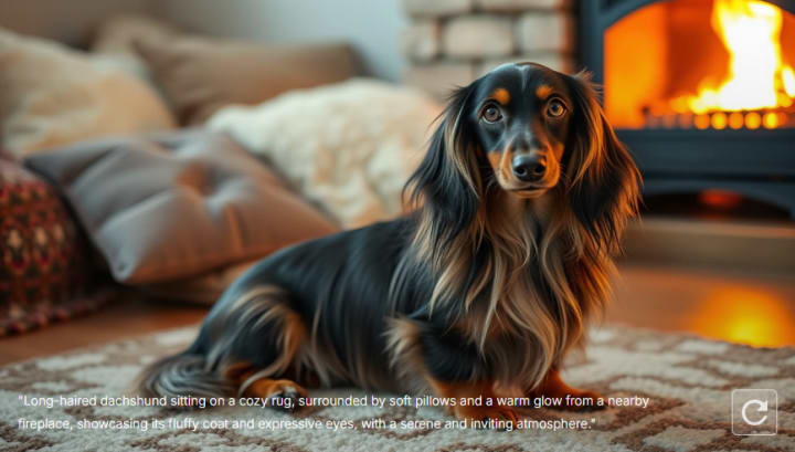 "Long-haired dachshund sitting on a cozy rug, surrounded by soft pillows and a warm glow from a nearby fireplace, showcasing its fluffy coat and expressive eyes, with a serene and inviting atmosphere."