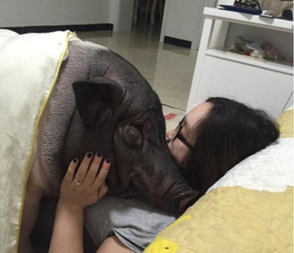 The girl adopted a pet pig and slept in the same bed with it