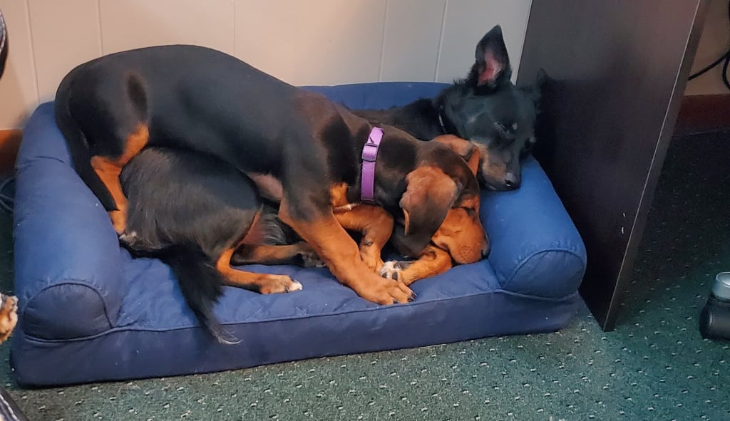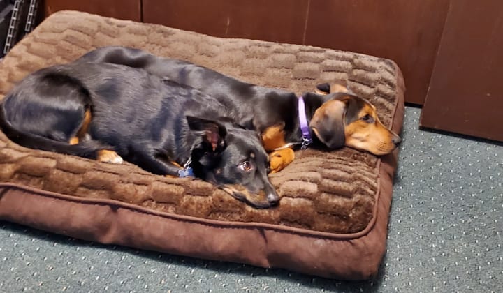 Almost a year later we adopted another puppy, this one a basset hound mix, and named her Hel, after Fenrir’s sister in the myths. Fortunately, she is infinitely cuter than the Hel of myth. Now they both keep me company while I work. Hel has also presented a few challenges with potty training, but I was better prepared for that this time around. They also keep each other company, Fenrir and Hel love to play. They rough house with each other for about half the day, between naps of course. I find that even though my work sometimes stresses me out, being able to turn around and see them wrestling or cuddling on their big dog bed tends to help me wind back down a bit.