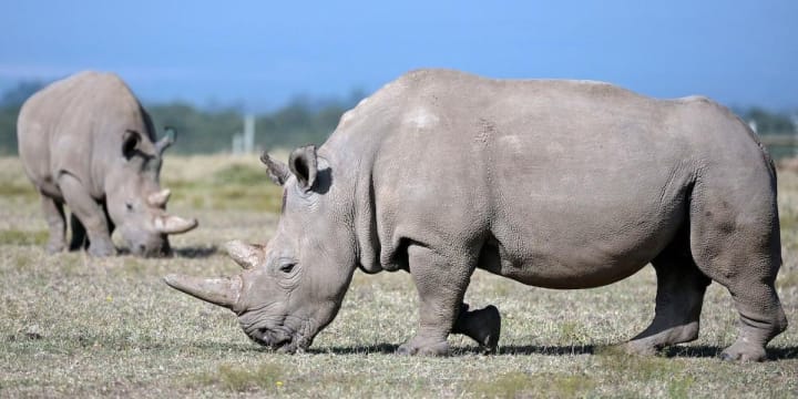 Northern White Rhinoceroses became extinct due to poaching and loss of habitat. The last two living Northern White Rhinos in existence were females with the last male dying in 2018. It was not possible to create a lab-created Northern White Rhino and they became extinct.