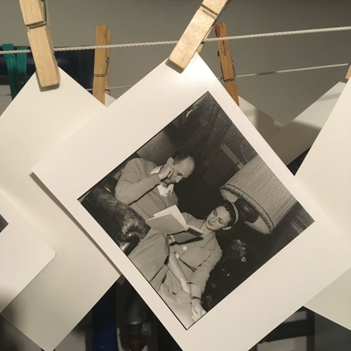 We just came out of the garage-darkroom, where we were printing from a negative he found in his parents’ boxes. That’s a picture of my grandparents sitting in an unknown living room. He’s reading a book as she looks down, smiling. We wonder whether in her left hand, just outside the frame, there may be a cigarette.