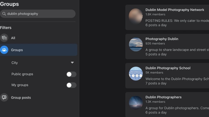 Go to the search bar on Facebook and put in a search keyword. To begin with, try ‘[your location] models’. Hit search and then make sure to select ‘groups’ on the left hand side to filter the results so that you only see groups.