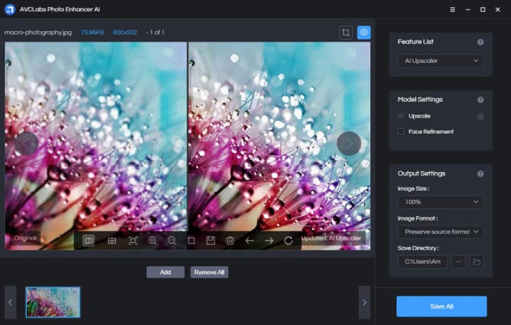 There are 5 built-in AI Features in AVCLabs Photo Enhancer AI: AI Upscaler, AI Denoiser, AI Color Calibration, AI BG Removal or AI Colorizer to meet users’ different demands. To make your macro photos sharper, you can choose the AI Upscaler.