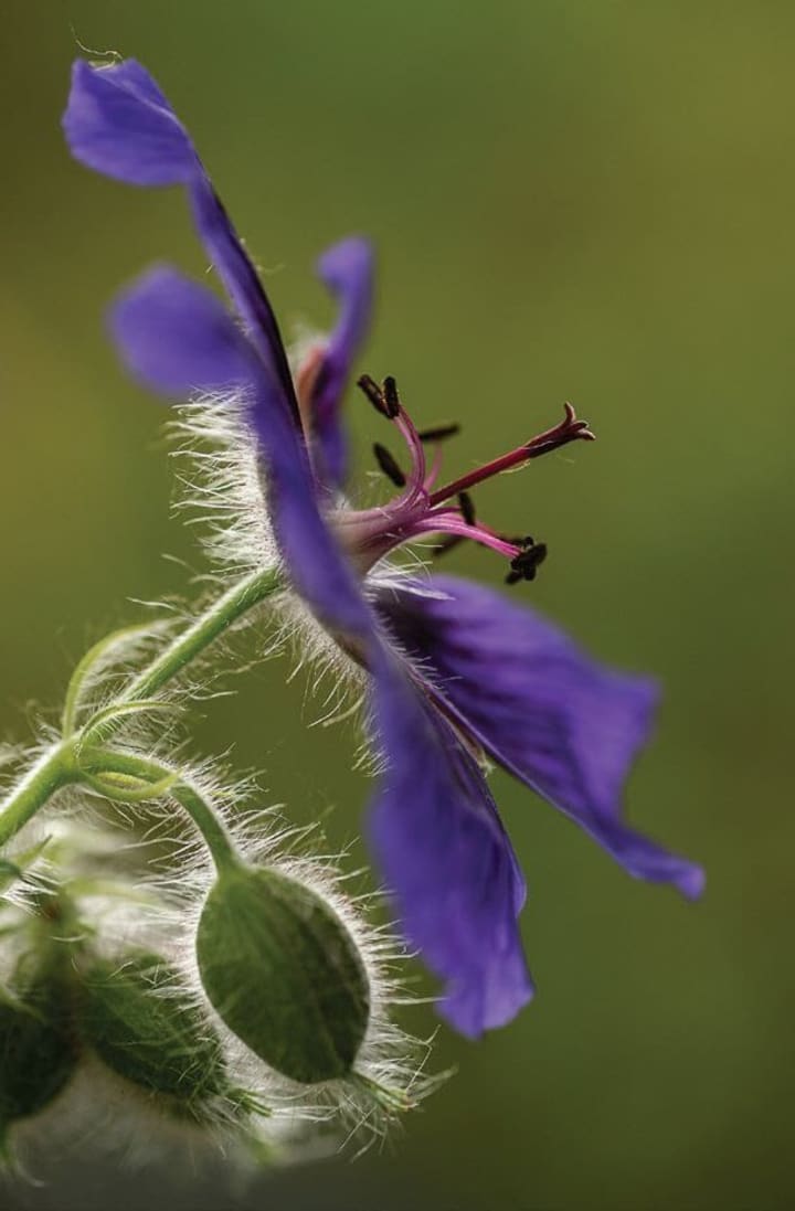 The fine hairs on the geranium flower are highlighted by the backlight.