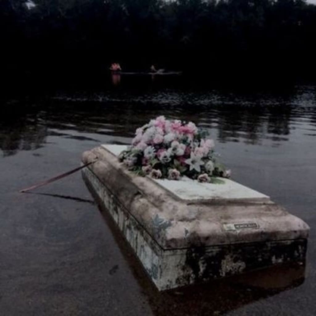 Floating casket with flowers via Tumblr (unknown source).