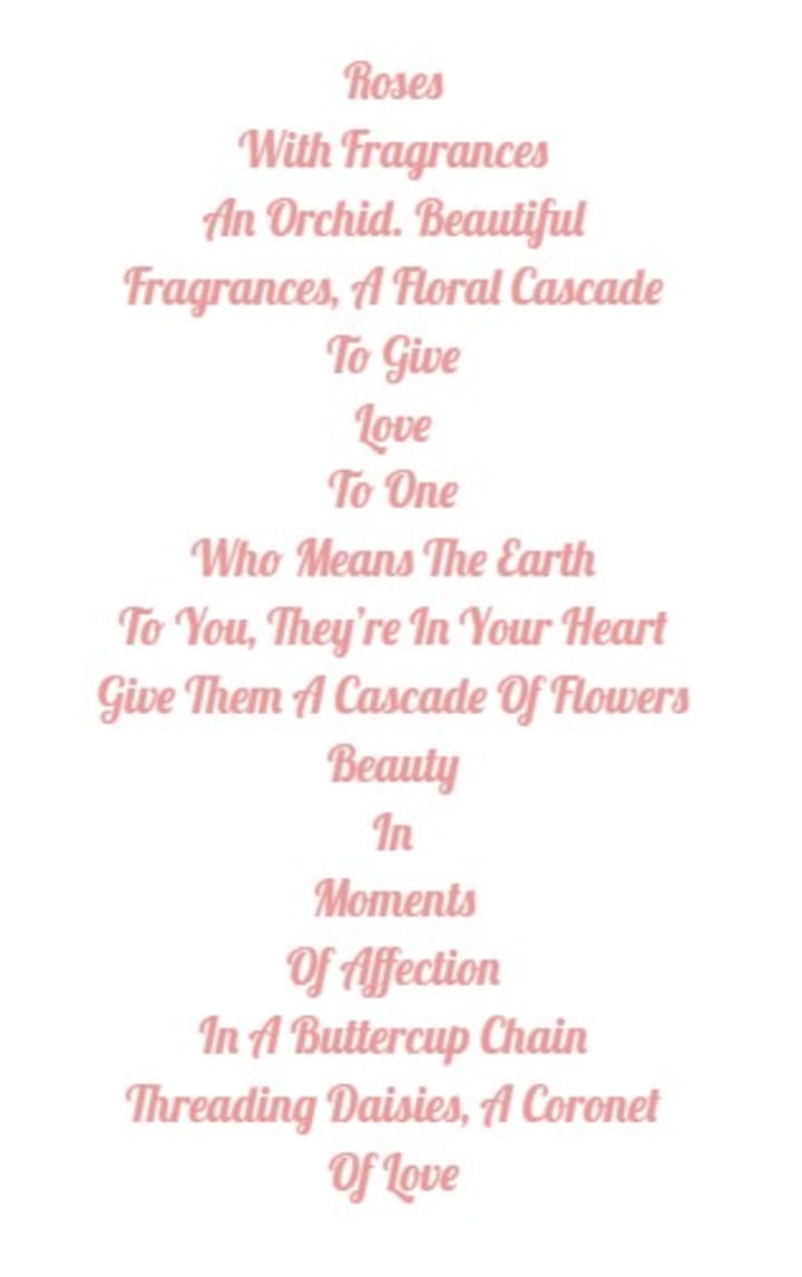 I wanted to write a poem about flowers and ideally, the cinquain should be visually centred to give it a visual identity as well as a lyrical one. I thought about creating an image of a flower where each petal was a verse but that is something for the future.