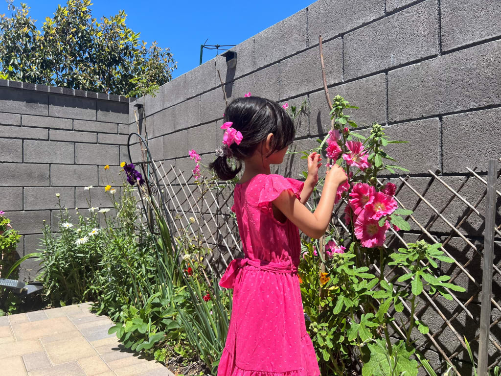 On this spring morning, my little daughter girl sits in the backyard garden, under the blue sky, playing with her teddy bear