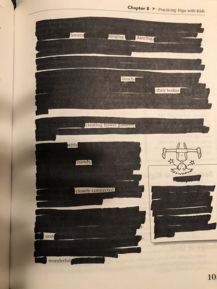 Occasionally, I would find a title that caught my interest. Something aggressively political or pretentious from the self-help section would make its way into the pile, and I set it aside. From Ann Coulter's books to The Complete Idiot's Guide to Yoga with Kids, I built a collection and scoured pages practicing blackout poetry.