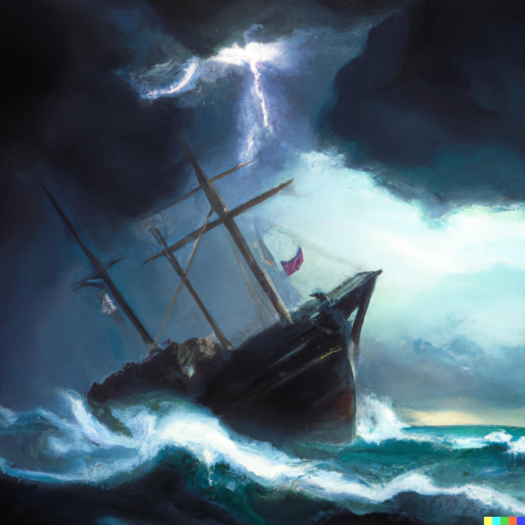 Sailors' hands bleed grasping rope,