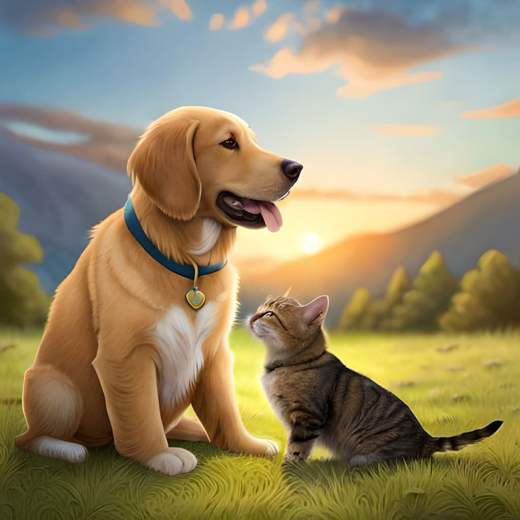 Once upon a time, in a small town nestled between rolling hills and verdant forests, there lived a cat and a dog. The cat, whose name was Luna, was a sleek and graceful feline with fur as black as a starless night. She had bright green eyes that sparkled like emeralds and a tail that was always held high with pride. The dog, whose name was Max, was a scruffy terrier with fur as brown as the earth beneath his paws. He had floppy ears that bounced when he ran and a wagging tail that never stopped. Despite usually living next to each other, Luna and Max had never truly gotten along. They hissed, growled, barked, and snarled whenever they came into contact with one another. Max thought Luna was too distant and snobby, while Luna thought Max was too loud and animated. One day, the town was hit by a devastating storm. The windows were battered by the rain and howling gusts. In an effort to stay warm and dry, Luna cuddled in her cute little bed with her tail tucked around her body. In contrast, Max was outside, barking at the thunder and the lightning in an effort to defend his small plot of land. Luna could hear a faint meowing coming from the outside as the storm continued to roar. When she peered out of her window, she noticed a small kitten shivering in the rain and hiding under a bush. Without hesitation, Luna walked into the blizzard to the kitten's aid. She carried the kitten back to her comfy bed and cuddled with it there till the storm subsided while holding the cat in her teeth. Max observed Luna and the cat through his window the following morning. He was taken aback by how maternal Luna was acting toward the little kitten, and a small part of his heart melted. He went to Luna's residence and enquired as to whether he could assist with caring for the kitten as well. Luna was initially hesitant but eventually decided to go along because she was still a little apprehensive about Max. Due to a small kitten and a significant storm, Luna and Max ended up becoming unlikely friends. While Max taught Luna how to be kind and patient, Luna in turn taught Max how to be wacky and spontaneous. They had fun together, explored the town, and chased each other across the fields during the day. However, a swarm of stray dogs that attacked the town put their friendship to the test. They were large and hostile and showed no consideration for the animals or their owners. Max, who had always been a courageous dog, confronted them by growling, biting, and barking. Being a cautious cat by nature, Luna hid inside her home out of concern for her safety. But when Max was hurt during the fight, Luna once more came to his aid. She held him close and licked his wounds till he felt better. Together, they devised a strategy to expel the stray dogs from the community. Once more safe in the town, they enlisted the assistance of other animals and their owners. After the conflict was resolved, Luna and Max became aware of how much they had come to respect and love one another. They acknowledged that they had made a mistake by comparing people solely on the basis of their features and species. They had learned that true friendship was about accepting and loving each other for who they were, not about sharing the same opinions or beliefs. With generosity and loyalty, Luna and Max went on to live happily ever after, paw in paw, side by side, protecting their town and one another. Max and Luna's friendship got deeper over time. They experienced a great deal of adventures and difficulties together, but they were always there for one another. Luna and Max made the decision to participate in the town's pet show that was held one summer. Max displayed his agility and obedience in the canine division while Luna displayed her grace and elegance in the cat category. Luna and Max won first place in their respective categories after wowing the judges with their performance. A year's worth of pet food was awarded as the reward, which they distributed to all the local animals. Everyone in the community adored Luna and Max for their bravery, generosity, and friendship, and they had emerged as the town's heroes. The relationship between Luna and Max was, however, the nicest aspect of it all. They had conquered their preconceptions, fears, and differences to become the closest of friends. They had demonstrated that, provided one had an open heart and mind, even the most improbable of companions might find love and happiness. Luna and Max spent their days enjoying the weather, cuddling by the fire, and chasing each other around the fields as a result. They served as a constant reminder to the town's animals and their owners that friendship has no bounds and that love is the most powerful force of all. Max and Luna grew older together as the years passed, but their devotion never wavered. They had shared a great deal of experiences and memories, yet they were aware that their bond was unshakable. Luna became unwell one day. Max stayed by her side the entire time, soothing and warming her. Even when the vet came to check on her, he wouldn't leave her. As Luna's condition deteriorated, Max realized that time was of the essence. Luna was weary and worn out as she laid in bed on her last day. Max lingered by her side, kissing her neck and licking her face. Max could see that Luna was at calm as she raised her head to gaze at him and had sparkling green eyes. Max howled in sorrow as Luna breathed her final breath. Though he was grateful for their time together, he knew he would miss her more than anything. Max carried on being a hero to the animals of the town in Luna's honor. He adopted the position of the guardian, constantly prepared to protect his buddies from harm. However, he never forgot about Luna and paid a daily visit to her grave, leaving toys and flowers as a memento of their friendship. As the years passed, Max also grew older. One day, while sleeping quietly, he passed away surrounded by all the animals he had guarded. The villag