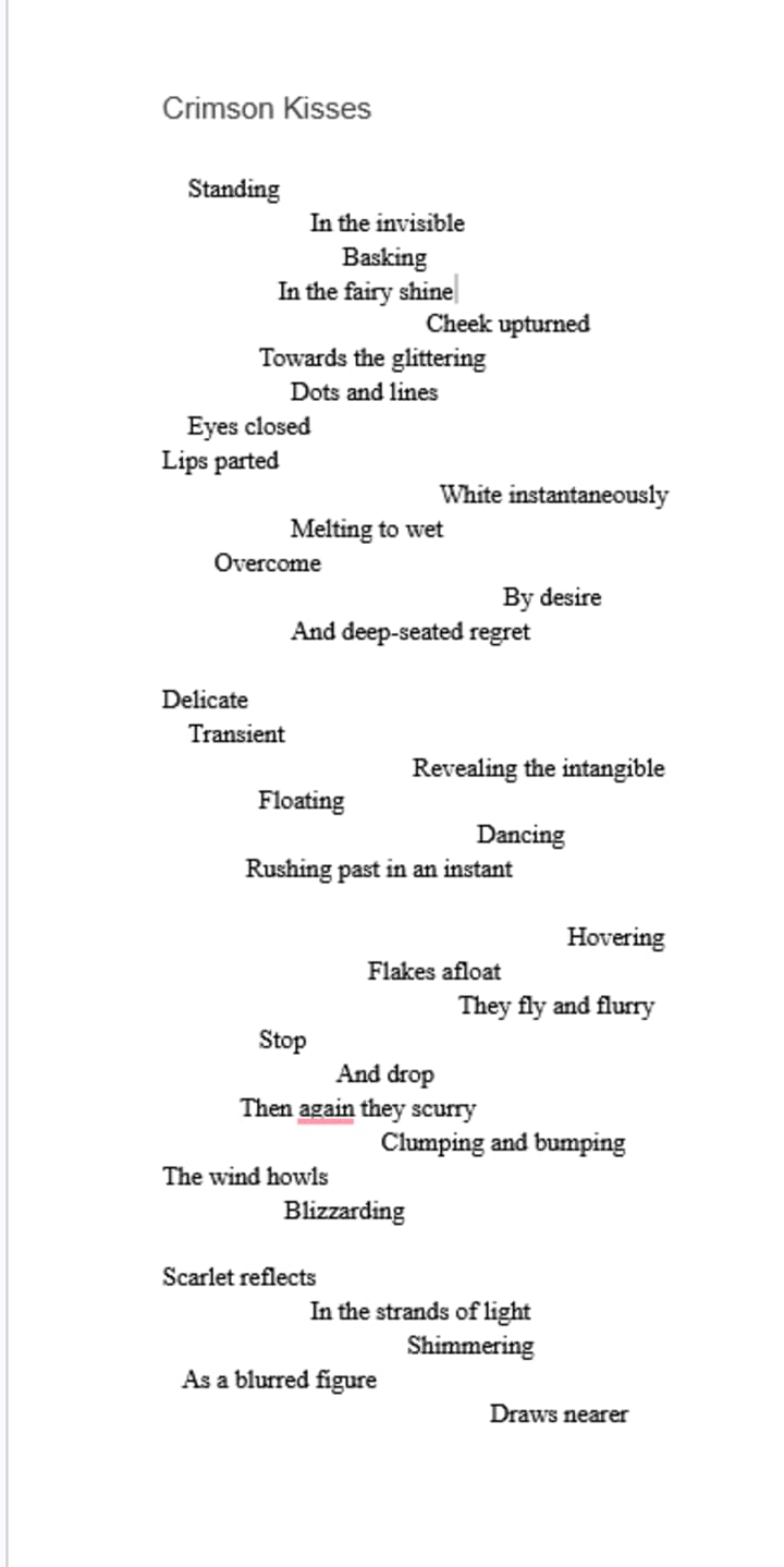 This is one of my more experimental pieces, with a format designed to evoke the sensation of falling snow. It looked like the formatting held until I published it, which is highly frustrating. I am including screenshots of the original format. I chose the time between the beginning and the mysterious end of a midnight stroll in the falling snow to set this entry to the Somewhere Between Here and There challenge prompt.
