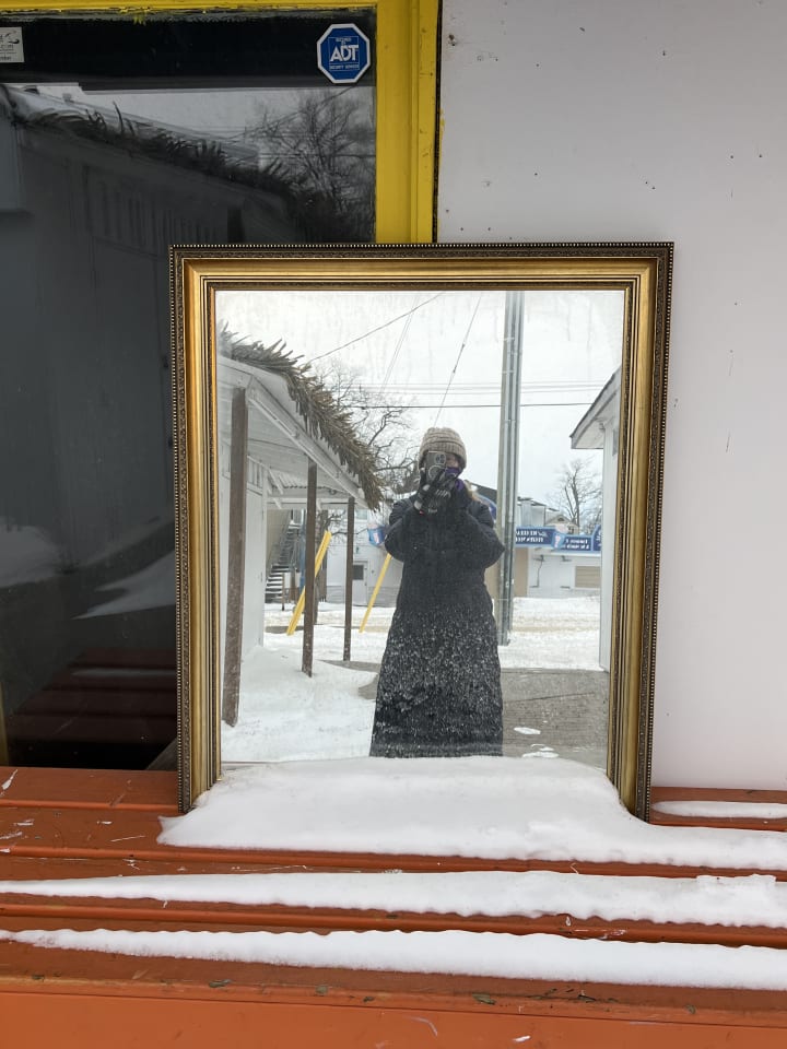 I peer through my window, adorned by the howling winds' most recent design.