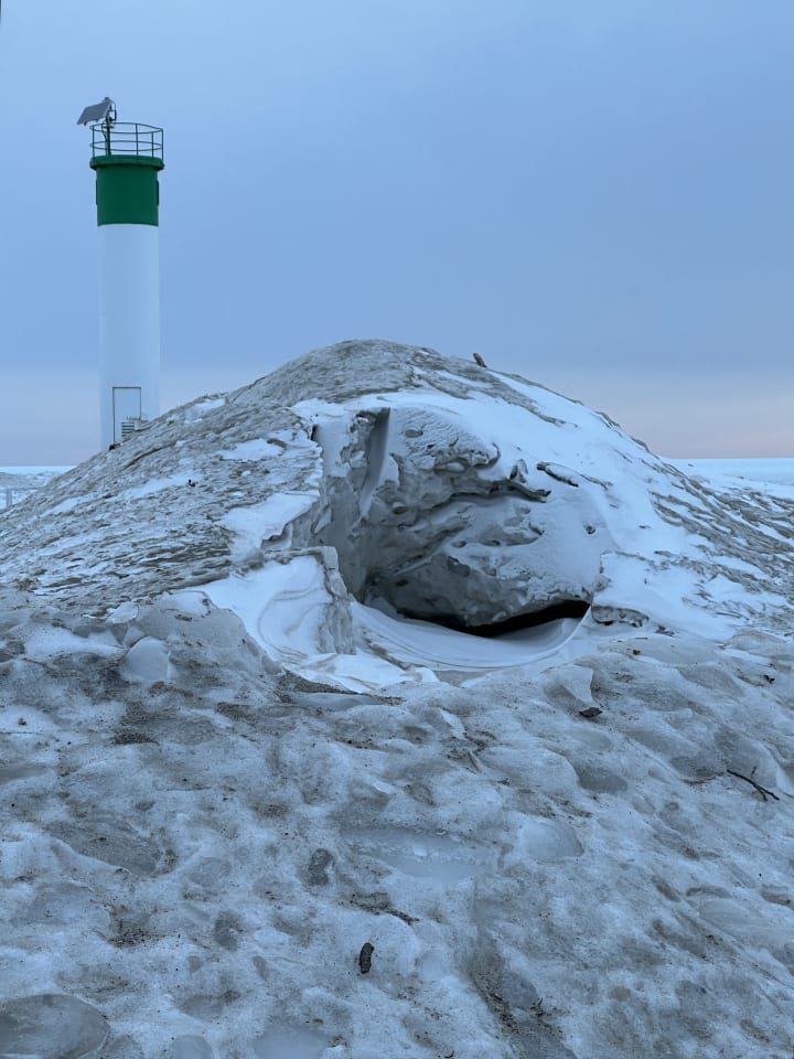 Wind blows snowy white veils from the beach. Storms collaborated with the waves to amalgamate sand and ice into fantastical sculptures.