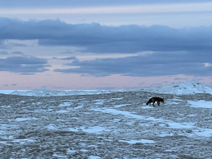 There’s another soul out there. A fox far out on the ice shelf, following its senses. Scouting for stranded fish or fowl, perhaps leftovers from an eagle’s prey.