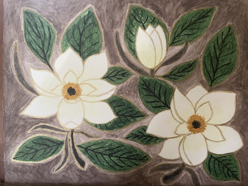 P.S. This is a revised version of my earlier poem, my first ever attempt at (somewhat) rhyming poetry, for Kayleigh’s challenge below. The magnolia painting is my own work in progress as well. I’d like to think that when it’s my time I’d float away on the bed of magnolia flowers.