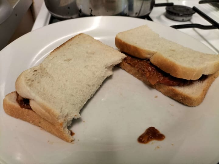 For those unfamiliar with the vernacular, a piece in Scotland is a simple sandwich, usually white bread with some butter, but can have jam or something else inside it. It was a common snack when I was growing up. Given my Nonna's heritage as an Italian-born immigrant, she took the humble piece and elevated it by infusing it with her sugo, pasta sauce. So when we went to her's for lunch on a Sunday, or other days and occasions, she would give us a sugo piece. It was not just a way of keeping us sated until our pasta followed by salad, chicken, or cured, cold meats, and roast potatoes meal was ready, it became a tradition. For the challenge, as there is a lack of stock photos of sugo pieces on the internet, I made sugo just for the purpose of having images of a sugo piece. It was, sadly, not a patch on her's, but for the few bites it lasted, it transported me back there, to her house.