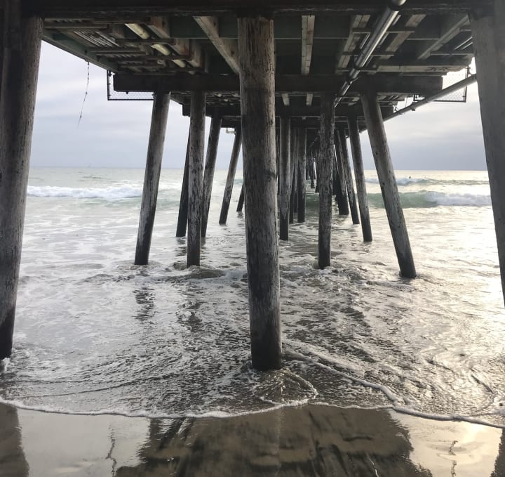Water and sand under the bridge, and my toes,