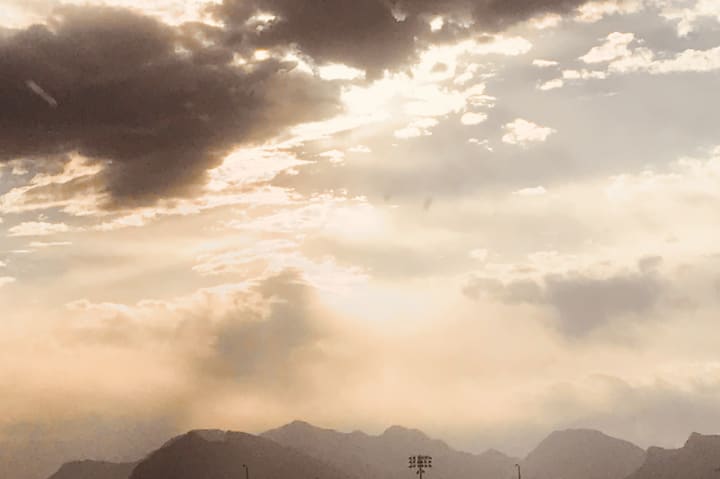 A cloudy evening rain still falling in the distance.