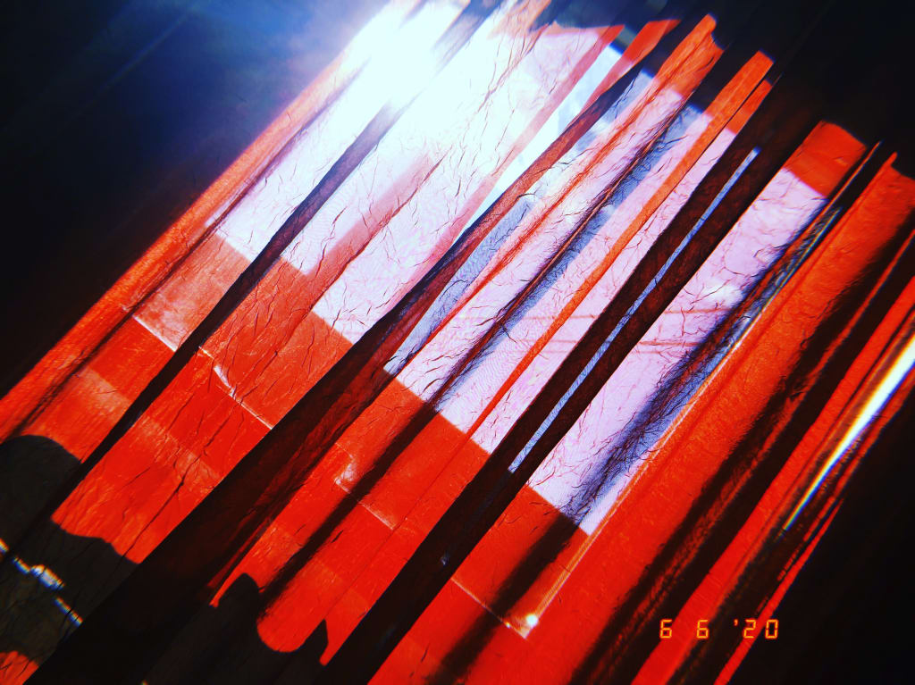 The red mixes with the blue as the yellow embers squeeze into the middle. Clouds roll through light and fluffy like the pancakes children enjoy in the early morning rushes. Shadows shown throughout to show what we are blocking from the sun. This shows us what we need to pay attention to so it is all equal. Light floods through the gaps, showing fires of life and love into the room.