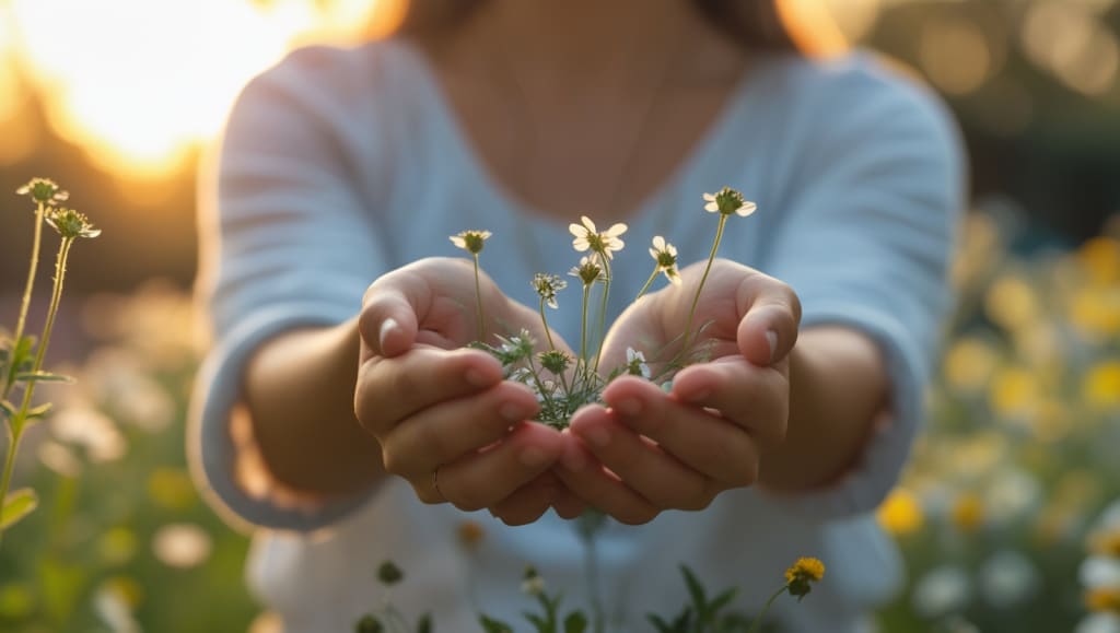 holding a handful of tiny flowers