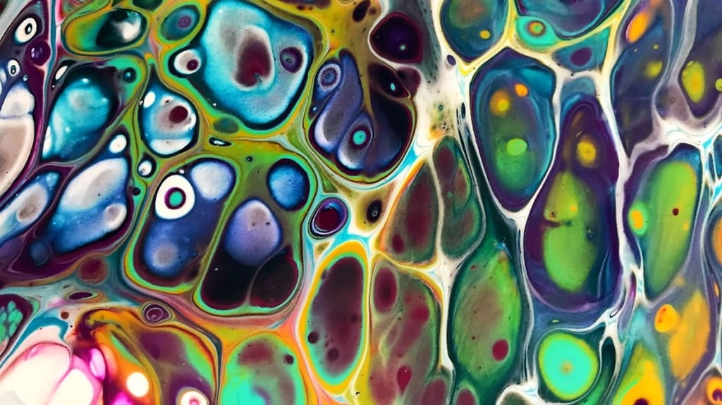 Fluid art painting from Tumblr (unnamed artist) of cool tones with splashes of orange and maroon, almost as though citrus fruit has sublimely molded.