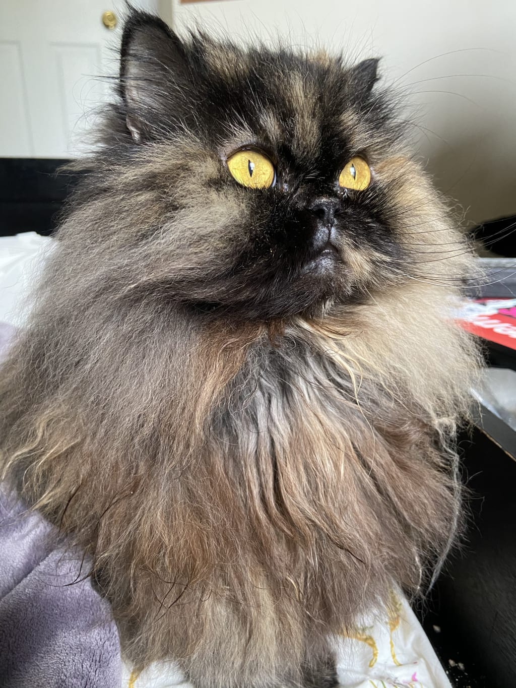 The tortoise-shell cat and I silently study