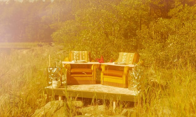 Under a table – still shaking with the weight of the guest’s unfinished drinks.