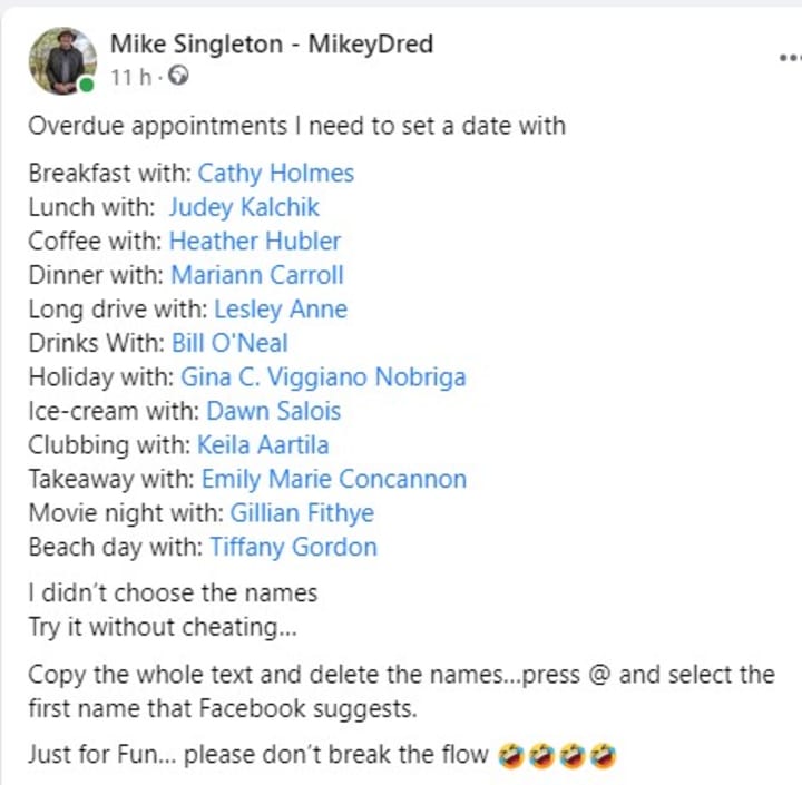Today on Facebook my friend Karen included me in a list of dates to plan. I shared it and almost all the people who came up for me were Vocal friends. Here is a screenshot. Cathy Holmes and Heather Hubler suggested I write a story for Breakfast with Cathy and Coffee with Heather.