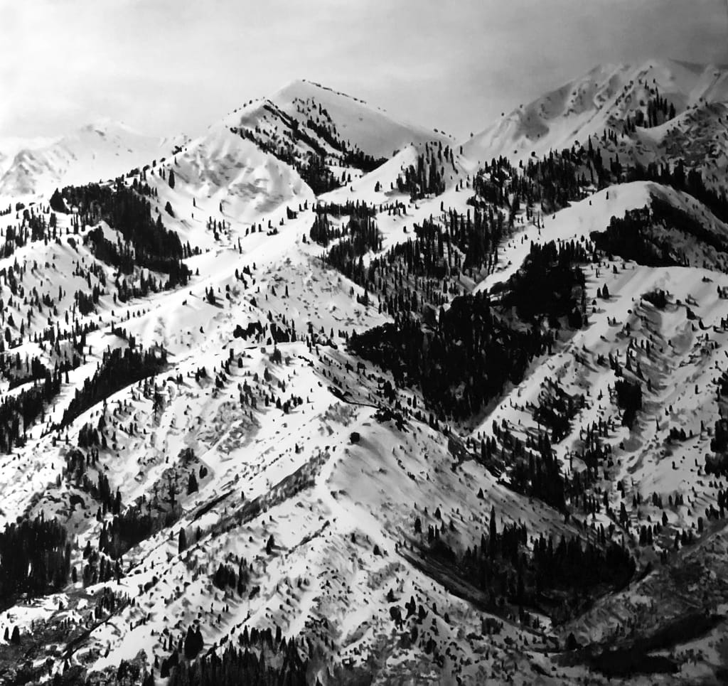 Jagged and snow-capped, she sees.