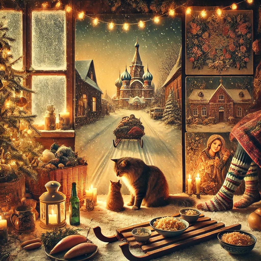 The cat is rubbing against my leg does not want to leave me to go on a snowy journey reminiscent of childhood not even just memories of my own but memories of worlds that evoke a period of world immersion in the Christmas Eve time of warmth, love, family, peace and the world in which the cheer changes for the better bringing humor out of nowhere one doesn't know from where on