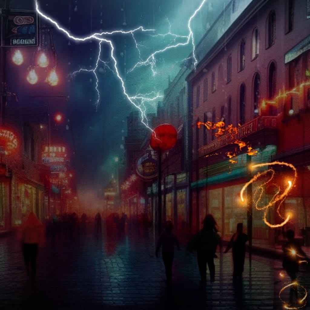 The night is lit up by street lamps and neon tavern signs. The flashes of lightning begin to light up the night's sky.