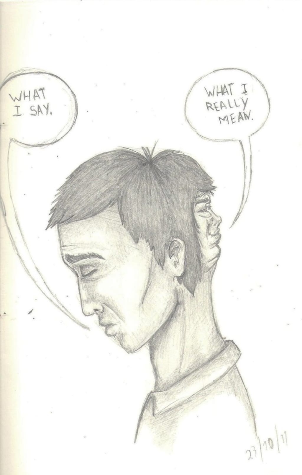 I hold you in my pocket where I try to distance you from my head. I push your judgment down along with everything you’ve said. I wish you would leave me alone, I wish I didn’t have to cry, I wish you didn’t follow me around. Nothing will be rid of you no matter how hard I try. I'm never good enough, everything I do is disastrous. That’s what’s imprinted in my brain. It’s not just me, it’s not just me! Anyone would have gone insane. Why can’t you be satisfied? Are you running away from your fears? The fears of seeing who you actually are, hearing your words with your own ears?